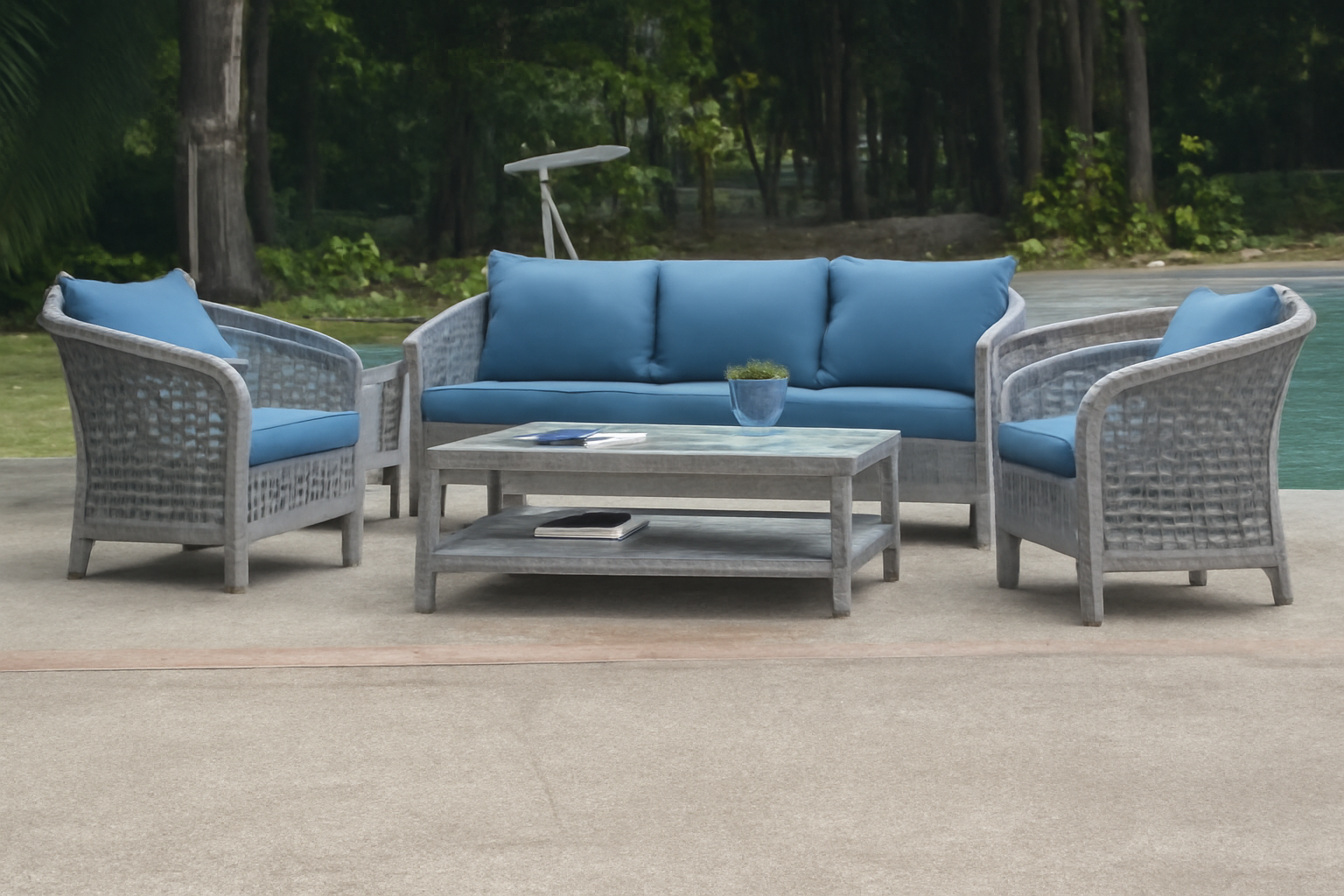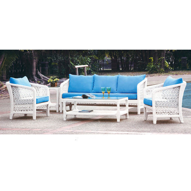 Embrace Mediterranean chic with this vibrant sofa set, featuring a 5-seater with intricate white wicker detailing and stunning cushions. The rectangular wicker coffee table ties the set together, offering both style and convenience for outdoor living.