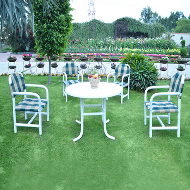 Welcome serenity and style into your garden or patio with the Fresh Heaven Outdoor Dining Set. This beautifully simple yet elegant 5-piece ensemble includes a round white dining table and four cushioned armchairs, each featuring a blue and white checkered pattern for a fresh, coastal-inspired look. Whether you're enjoying morning tea or hosting an evening get-together, this set provides a comfortable and inviting setting for outdoor dining and relaxation. Built with weather-resistant materials and PVC-pipe construction, it is made to endure outdoor conditions while maintaining its charm. The smooth tabletop and supportive cushions combine practicality with comfort, making it a timeless addition to any outdoor space.