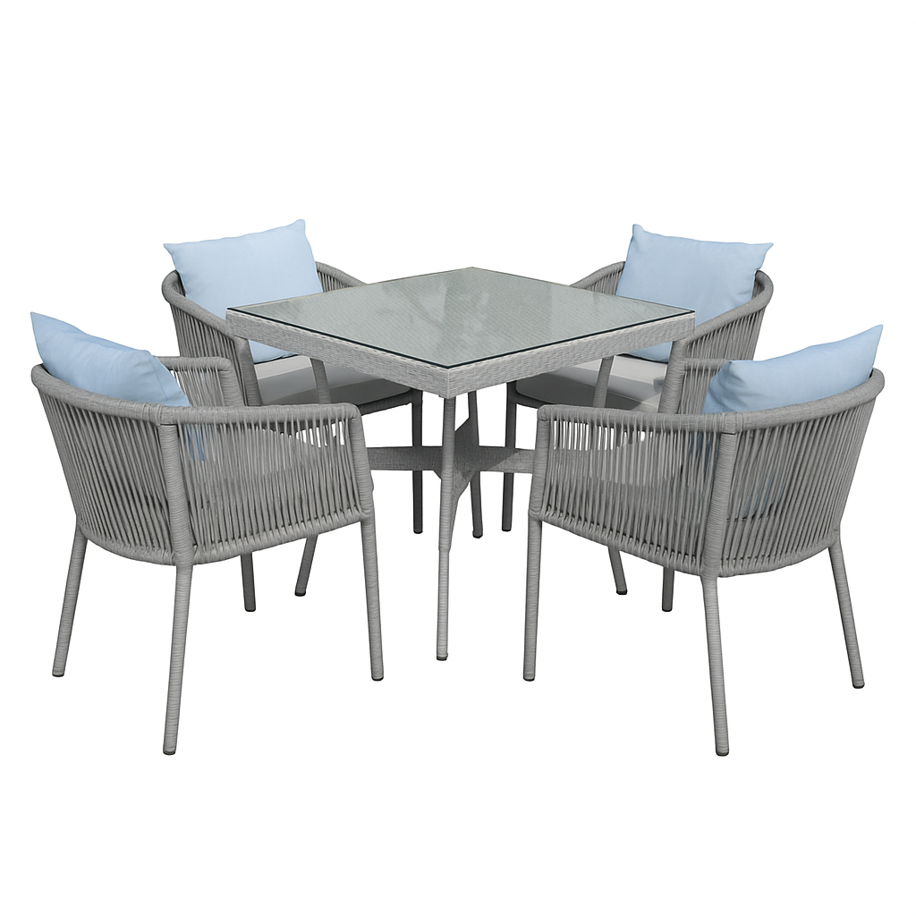 Bring Coastal Breeze to your patio with the Coastal Breeze Dining Set. Featuring 4 cream-finished rattan chairs with soft blue cushions and a 32"x32" glass-topped table, this set offers relaxed elegance perfect for al fresco meals and coastal vibes.