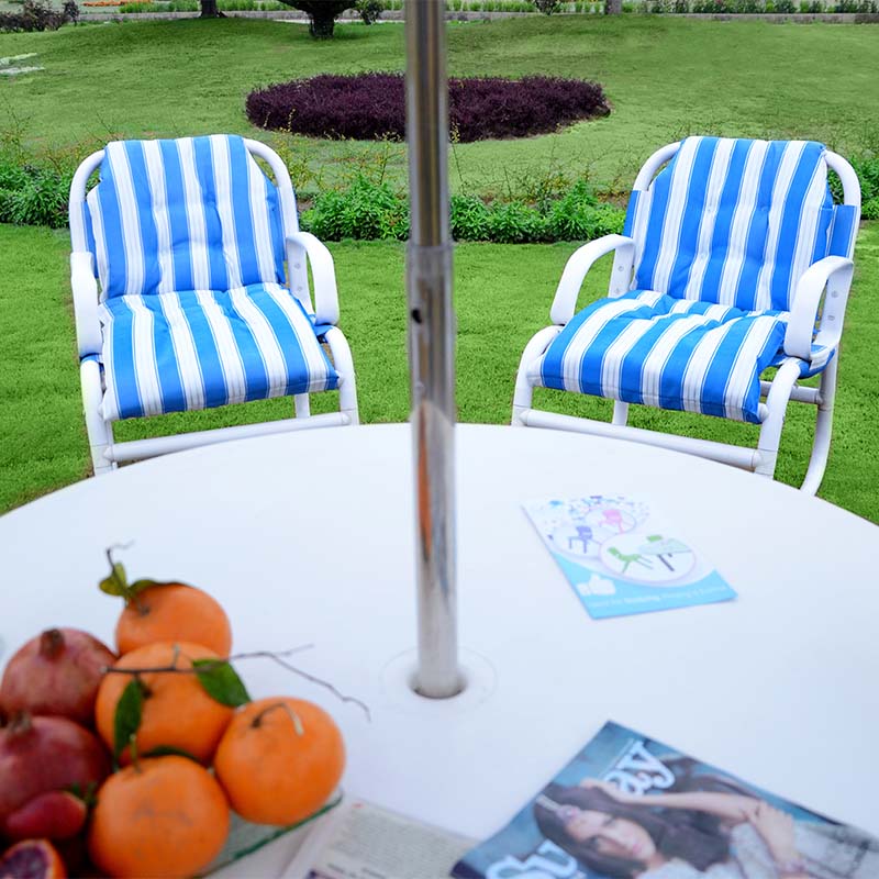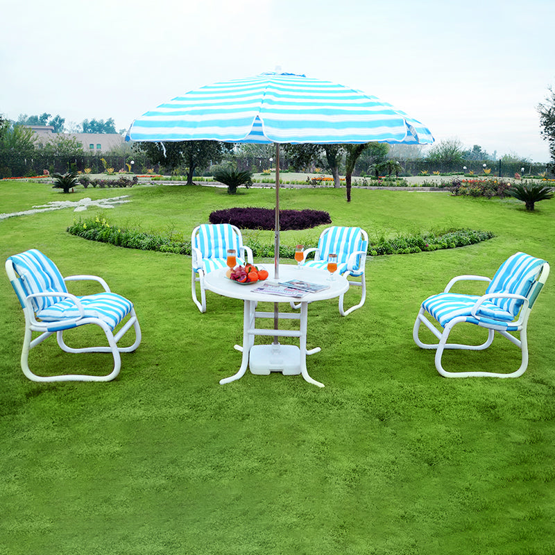 Create a charming retreat in your garden or patio with the Outdoor Dining Set. Featuring four ergonomically designed chairs with plush, blue-striped cushions and a sturdy white round table, this set is perfect for enjoying morning coffees, afternoon teas, or relaxed outdoor conversations. Crafted from weather-resistant materials with a powder-coated finish, it offers both durability and elegance. Ideal for lawns, terraces, or verandas, this set brings comfort and color to any outdoor space.