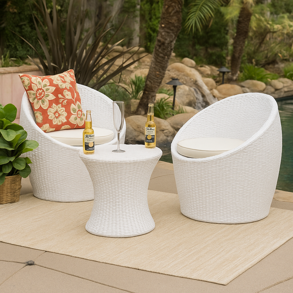 Make a bold statement with this Roubd missile outdoor set, featuring two curvaceous lounge chairs in sleek black wicker and a stylish hourglass-shaped table. The white cushions provide comfort and contrast, while the natural woven rug ties the ensemble together for an upscale, cozy retreat.