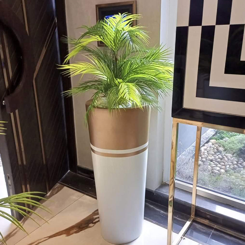 Add a touch of modern luxury to your décor with this Elegant cone shaped White & Gold Fiber Planter, expertly crafted for both indoor and outdoor spaces. The sleek tapered cone shape is complemented by a sophisticated dual-tone finish—matte white base with a lustrous metallic gold top and accent stripe.