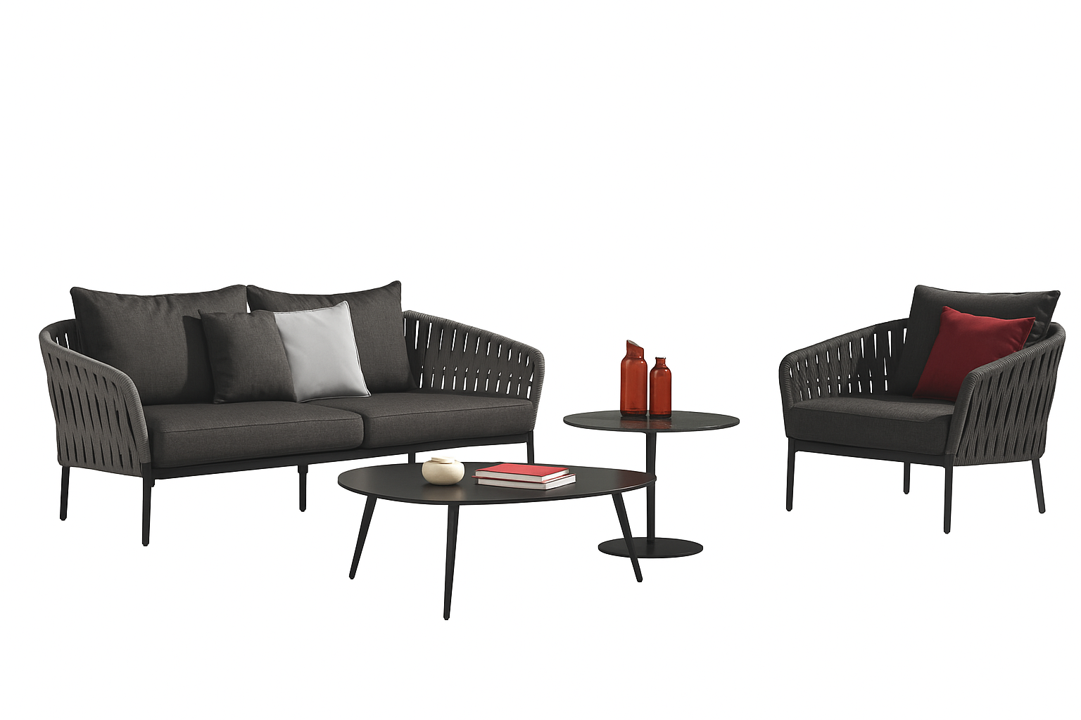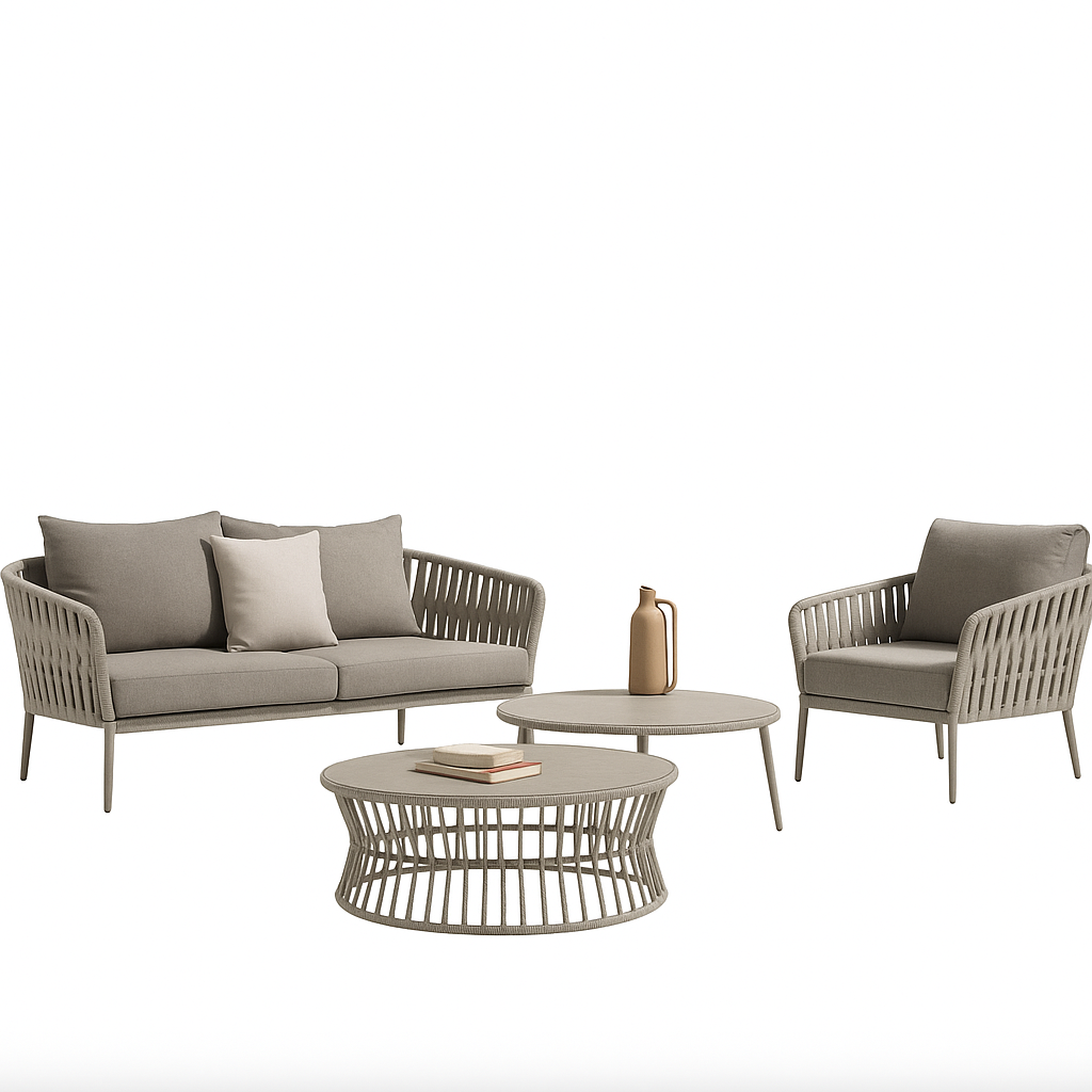 Create a refined escape in your backyard with the Havenweave Lounge Set. This 4-piece ensemble includes a sleek 2-seater sofa, two spacious single seater, and a modern round coffee table, blending minimalist design with functional comfort. With clean vertical slat frames in matte gray, this set is perfect for any garden, patio, or terrace.