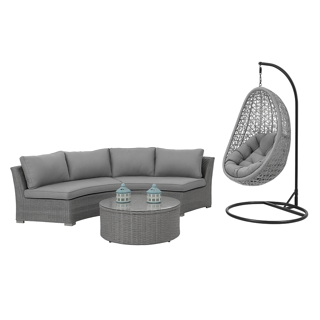 Bring rustic elegance to your outdoor space with the Countryside Charm Rattan Lounge Set. This 5-seater L-shaped sofa, paired with a cozy hanging swing and matching coffee table, creates the perfect setting for relaxing or entertaining. The earthy-toned rattan and deep charcoal gray cushions offer comfort and style, while the freestanding swing adds a playful, serene touch.