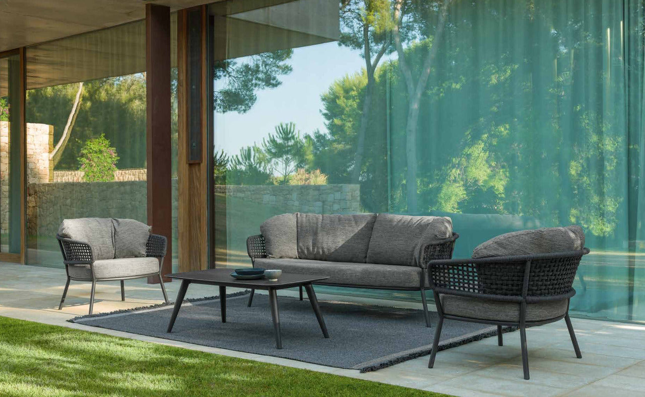A stylish and modern outdoor seating set featuring a three-seater sofa (4 Seater Sofa & Table 2'x3.6' ) (3+1+Table), two lounge chairs, and a sleek coffee table. Designed with a woven rope structure, metal frame, and plush grey cushions for superior comfort. Ideal for patios, gardens, and contemporary outdoor spaces.