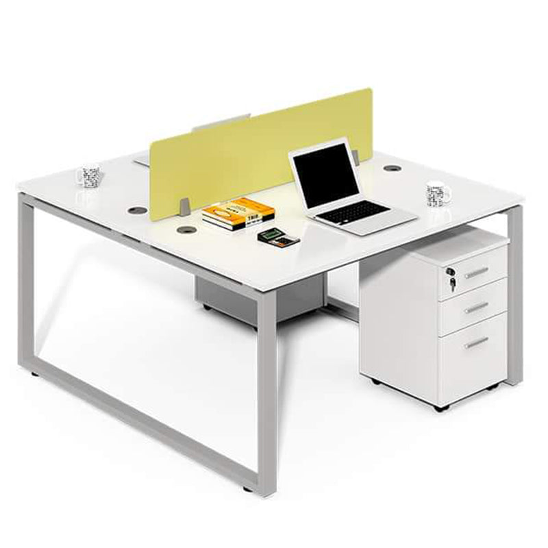 The OptiSpace Duo Workstation is designed to offer a sleek and productive environment for two users while maintaining personal space and functionality. Featuring a high-gloss white tabletop, a sturdy metal frame, and a vibrant partition screen, this modular desk brings style and organization into any modern office.