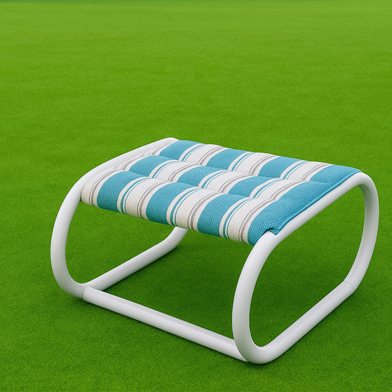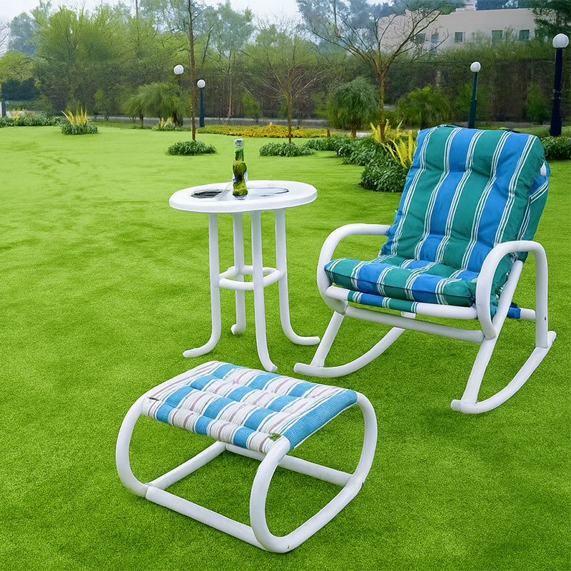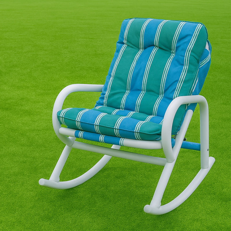 Add a touch of comfort and style to your outdoor space with this beautifully cushioned rocking chair set. Designed for relaxation, the sturdy white frame is paired with a soft, padded seat and backrest in a refreshing blue and green striped fabric. Ideal for gardens, patios, or terraces, this chair comes with a matching footrest and side table for your convenience—perfect for enjoying a drink, reading, or simply soaking in the tranquility of nature. Whether you're looking to unwind after a long day or add elegance to your outdoor setting, this rocking chair offers the ideal spot for serene moments and cozy lounging.
