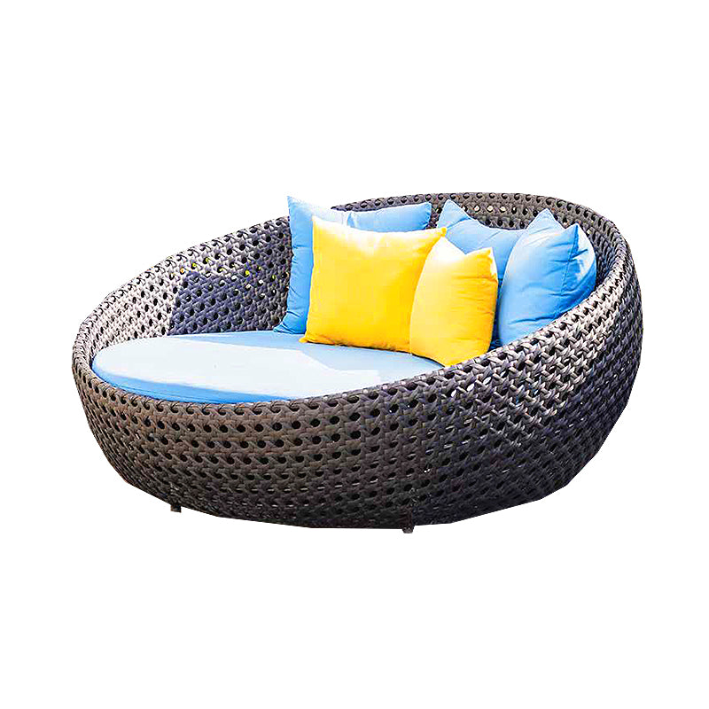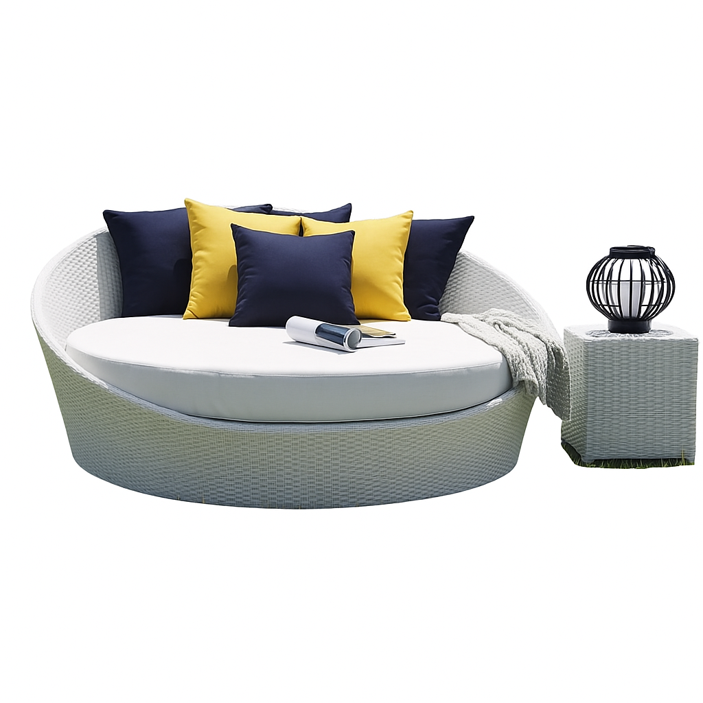 The Sunnyside Daybed Lounger With Side Table. offers a perfect blend of vibrant style and comfort, inviting you to unwind in the sun or shade. Featuring a plush, creamy-white cushion, this oversized daybed is complemented by yellow and navy pillows, adding a cheerful, nautical touch. With its sturdy, dark woven base, it's an ideal spot for reading, napping, or simply relaxing in your outdoor sanctuary.
