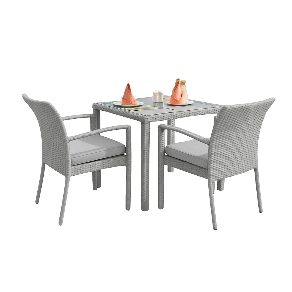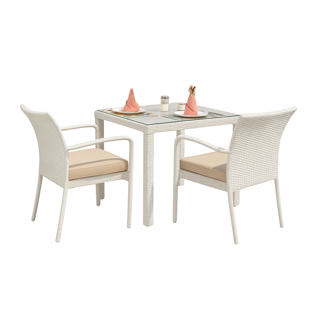 Bring island vibes to your patio with this elegant 2-seater dining set. Featuring two high-back rattan chairs with plush beige cushions and a 32"x32" square glass-topped table, it's perfect for cozy outdoor meals and sunset chats.