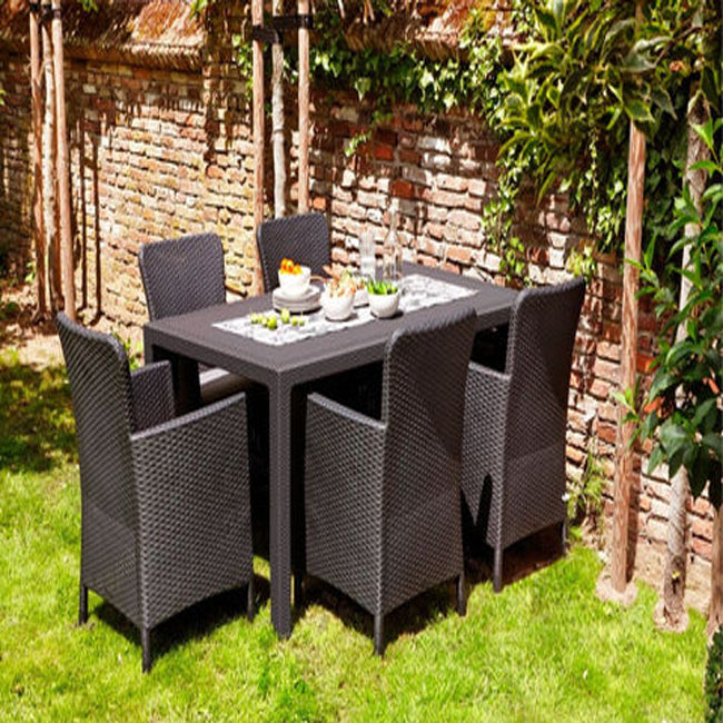 A perfect blend of modern elegance and outdoor functionality, the Urban Garden Dining Set features a sleek black rattan table with six matching chairs. Designed for stylish al fresco dining, this set enhances patios, garden corners, or backyard retreats with its clean lines and timeless weave.