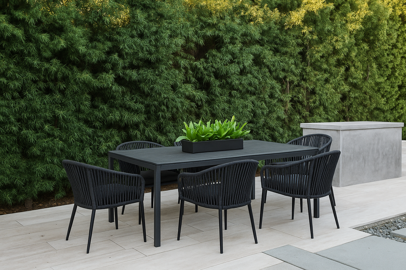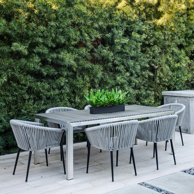 Enhance your outdoor dining with the Ventura Arm Chair Rope Furniture Set, featuring six ergonomic Ventura armchairs and a spacious 6' x 2.6' dining table with a Red Meranti wood top. The rope and sturdy metal frame create a stylish yet durable setup perfect for dining, entertaining, or relaxing outdoors.