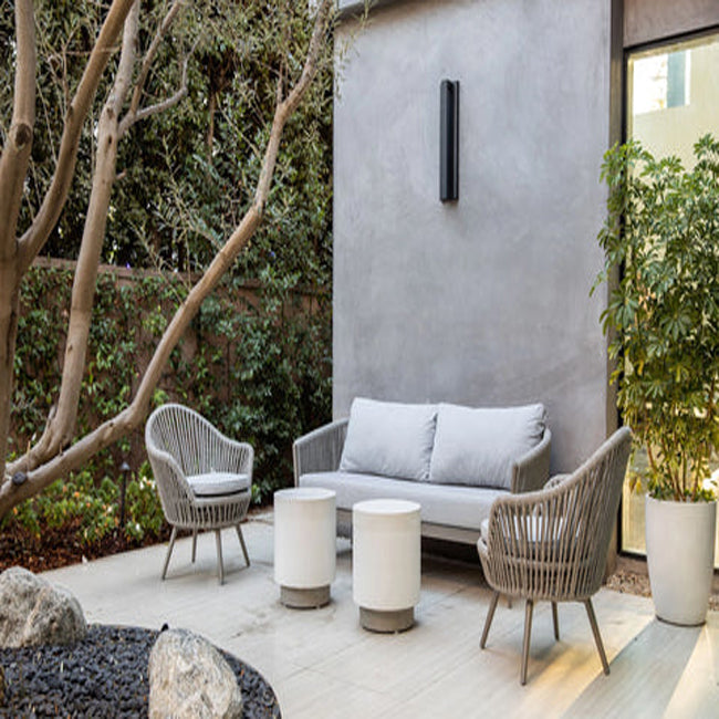 Elevate your outdoor living with the Ventura Swivel Rope Furniture Set, featuring two swivel chairs one single seater, a cushioned loveseat. The rope-wrapped frames provide a modern, light aesthetic, while cushions offer comfort for long hours of relaxation.