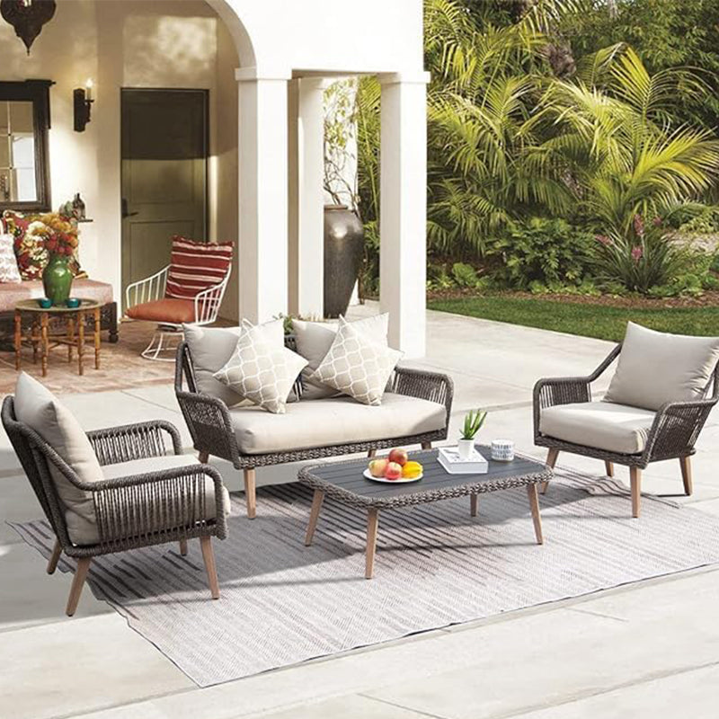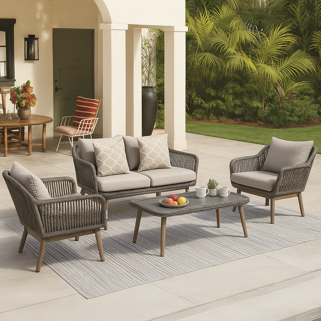 Create a warm and inviting outdoor oasis with the Veranda Luxe 4-Piece Outdoor Lounge Set. Featuring a chic blend of comfort and craftsmanship, this set includes a 2-seater sofa, two matching single armchairs, and a sleek 2' x 3.5' rectangular coffee table. Built with a robust metal-coated frame wrapped in stylish all-weather rope and paired with plush neutral cushions, this set delivers modern elegance and year-round durability for any patio, deck, or garden setting.