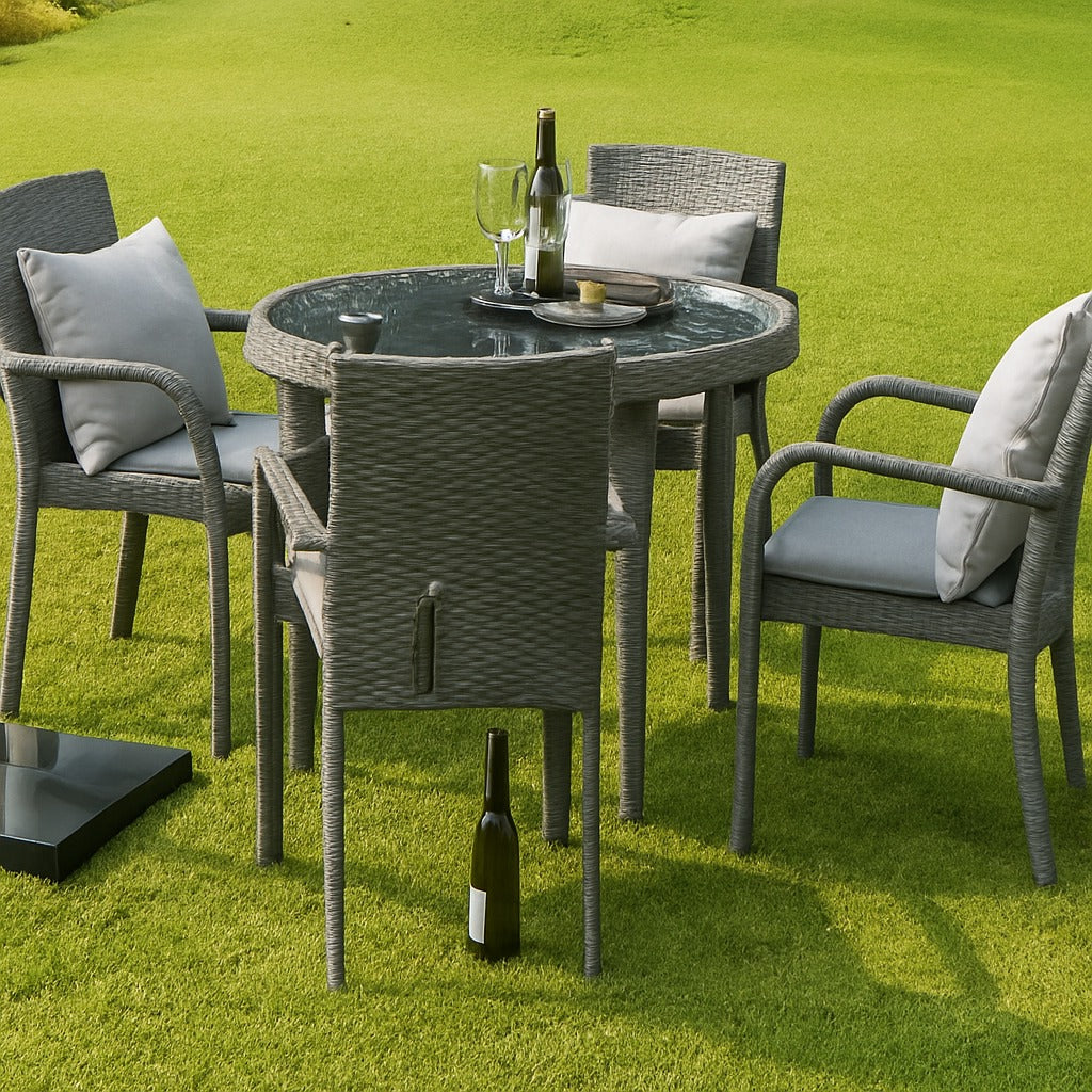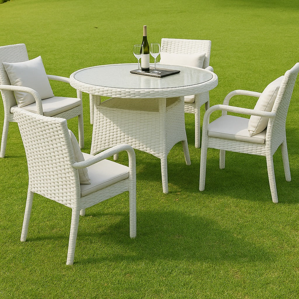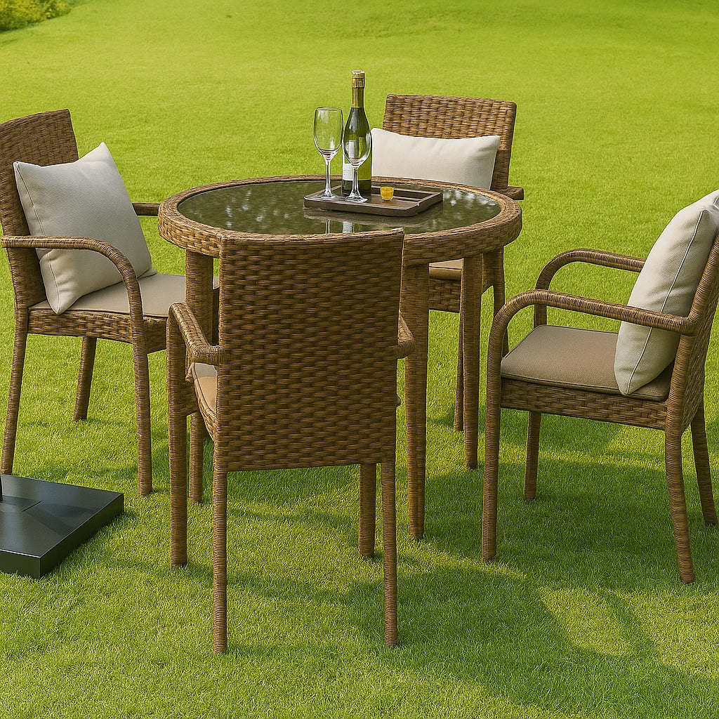 Bring the charm of vineyard dining to your backyard with the Vineyard Rattan Alfresco Dining Set 4 Chairs & Table 32" Round (without cushions) . This set includes four armchairs with natural rattan weave. The round glass-top table with a woven rattan base is perfect for outdoor meals and gatherings.