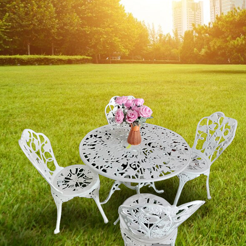 Bring timeless charm to your outdoor gatherings with this White Floral Cast Aluminum Patio Set. Featuring a round table with matching intricately designed chairs, this set is perfect for enjoying tea, brunch, or casual evening chats in the garden. Crafted from rust-proof cast aluminum with a classic white finish, it combines vintage elegance with all-weather durability.